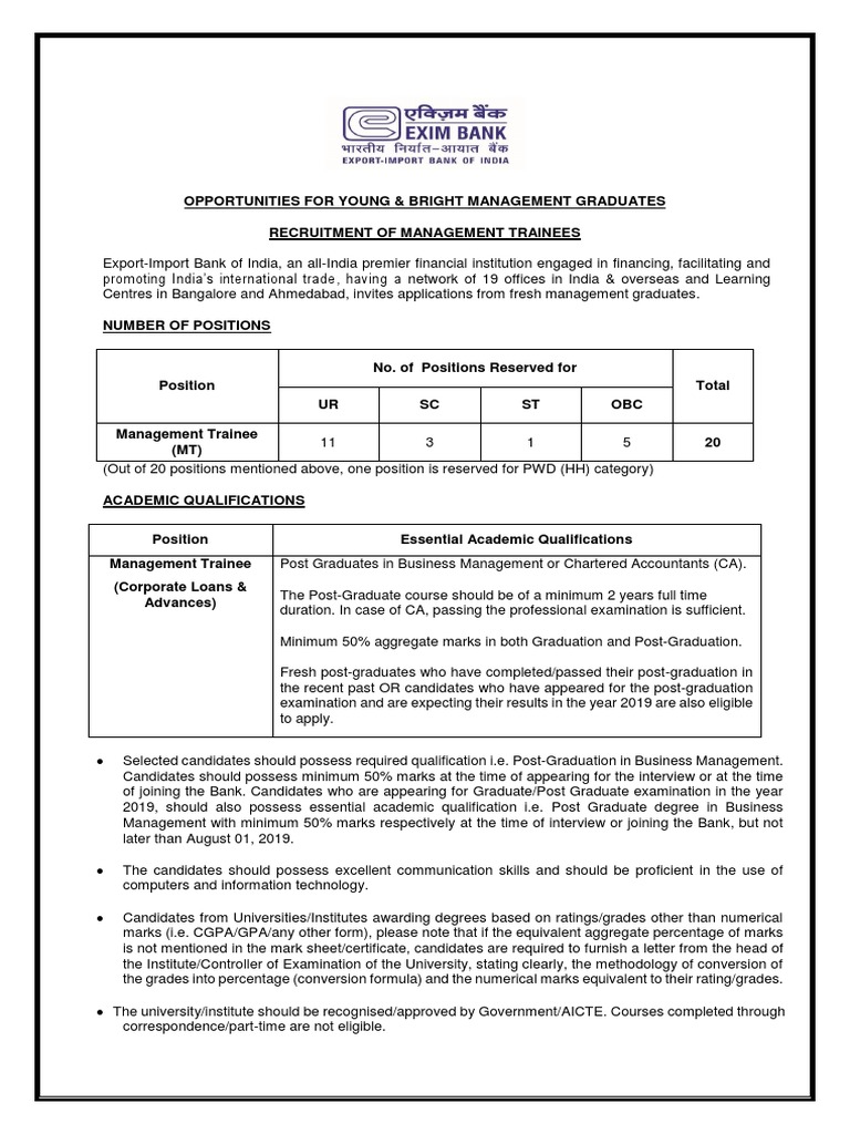 Recruitment Of Management Trainees In Exim Bank Postgraduate