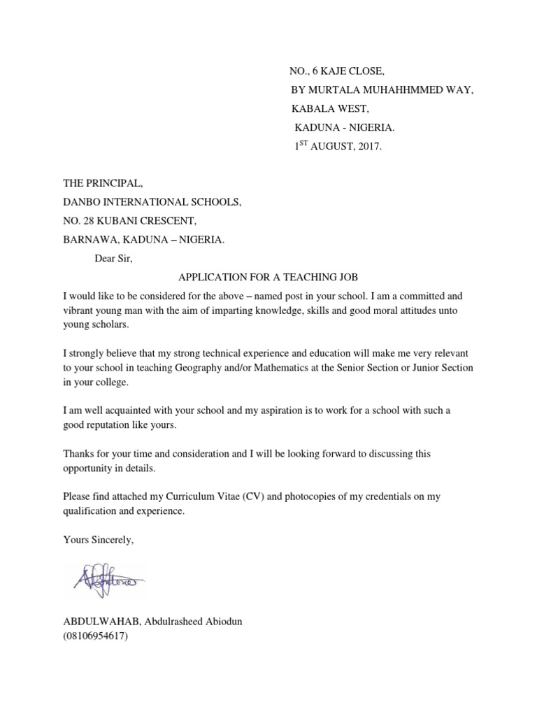 Teaching Job Application Letter In Nigeria